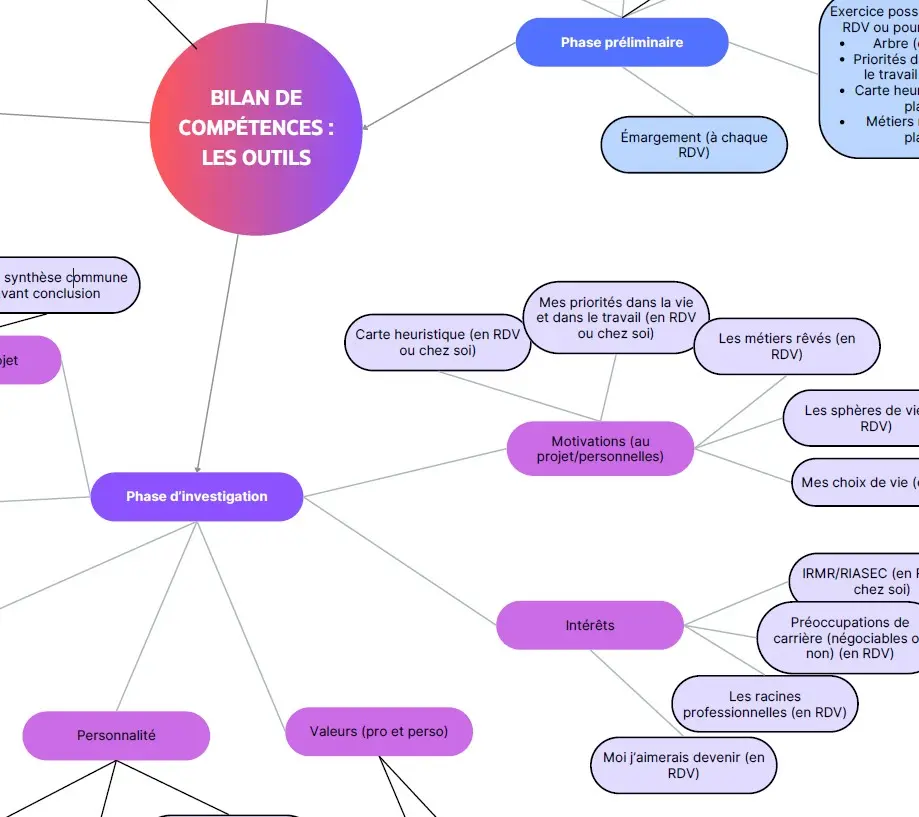 Le bilan de compétences permet d'explorer votre parcours professionnel et personnel, et aussi vos goûts, valeurs, appétences, afin de construire un tableau de vous, à l'instant T. Puis on explore ensemble vos envie professionnelles.